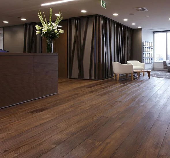For a cost-effective flooring solution with a variety of material looks like wood, stone, marble, and custom design, laminate floors are the right choice. These floors with HDF (High-density fibreboard) and a design print layer and a final print layer create ideal flooring visuals for your office, apartment, and retail area flooring. The aluminum oxide wear layer allows for 90% more scratch resistance for a durable, consistent floor performance.